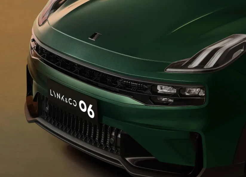 Skyline Vistas inspire Lynk & Co 06's grille, a bold, modern look that stands out.
