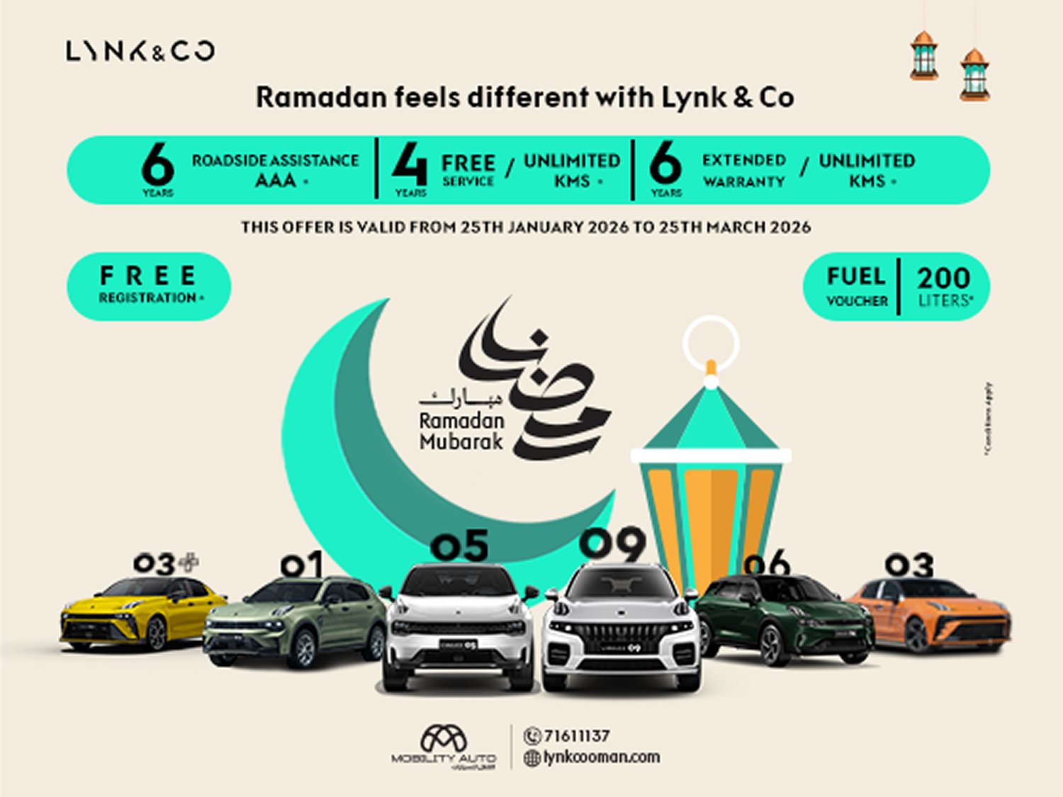 This Ramadan, Lynk & Co invites customers to experience a new expression of modern luxury, intelligent mobility and meaningful value with a special campaign that redefines what premium car ownership truly feels like. Mobility Auto, the official distributor of Lynk & Co in Oman, has unveiled an exclusive Ramadan offer designed to deliver not just short-term benefits, but long-term peace of mind and confidence for discerning drivers. Valid from January 25 to March 25, 2026, the Lynk & Co Ramadan campaign reflects the spirit of generosity and togetherness that defines the holy month, while reinforcing the brand’s commitment to innovative design, advanced technology and customer-centric ownership. At the heart of the campaign is a comprehensive ownership package that ensures customers enjoy worry-free driving for years to come. Every Lynk & Co purchased during the campaign is available with a 6-year extended warranty with unlimited mileage, 4 years or unlimited kilometres free service and 6 years AAA roadside assistance, offering unmatched reassurance and long-term value in the premium segment. Complementing these benefits are exclusive Ramadan rewards including 200 litres of free fuel and free vehicle registration, making the purchase experience seamless and truly rewarding (Conditions apply. Enthusiasts are encouraged to visit the Lynk & Co showroom for details). Lynk & Co’s growing range in Oman showcases the brand’s distinctive approach to mobility by combining attractive design, cutting-edge safety systems, intelligent connectivity and efficient powertrains. From dynamic SUVs to refined crossovers, the Lynk & Co range caters to drivers who seek individuality, performance and sustainability without compromise. Each model reflects the brand’s global vision of redefining premium mobility through innovation and forward-looking engineering. Globally, Lynk & Co continues to push boundaries with advancements in vehicle connectivity, driver-assistance technologies and smart mobility solutions, positioning itself as one of the most progressive automotive brands in the premium space. These innovations are fully embedded across the range available in Oman, offering customers vehicles that are as intelligent as they are stylish. This Ramadan, Lynk & Co invites customers to step into a world where premium design meets smart ownership and long-term reassurance. Visit Lynk & Co showrooms across Oman or call 24229100 to discover the full range and experience why Ramadan truly feels different with Lynk & Co.